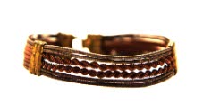 DescriptionFour wire bracelets. Two composed of eight strands of wound wire with a clasp, two composed of a single strand of wound wire.On View