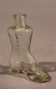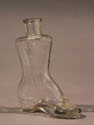 DescriptionGlass bottle shaped like a shoe or boot. Base of bottle isn't flat, but instead has a high heel. One side of the shoe has a wave and dot design that goes from the top of the foot to the top of the shoe just below the spout. Right above the toes is a half-disc that protrudes from the glass.On View