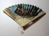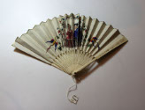 DescriptionIvory sticks are pierced in a simple line design.  Leaf is paper.  The border is stenciled in gold floral design with touches of pink and red.  The central scene is pen and ink with lithographed hands and faces, hand painted.  A group of women are shown praying at a shrine, one woman is standing.  On the back a couple is standing on a balcony surrounded by flowers and birds.  In small letters below the left side of the balcony are the words, "Seave par Willocys".On View