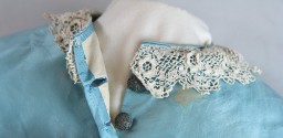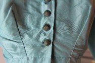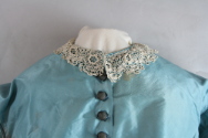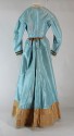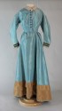 DescriptionLight blue taffeta skirt, gored, with fullness in back, semi-bustle, with short train. It is lined throughout with light weight brickram. There are three graduated bias bands of tan taffetas around the bottom of the skirt is bound with tan braid. Attached lace collar, crochet net covered buttons.