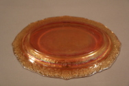 DescriptionCarnival glass.Orange glass platter with a raised rim. Floral patterns carved into the underside of the glass. Scalloped edge.