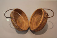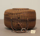 DescriptionFor carrying a dress cap. Brown and yellow wicker. 2 handles wrapped in brown cane. Round shape. Top and bottom same size. Fastener with ribbon tie.On View