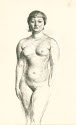 DescriptionRecto: profile of drawing of young black woman; a large button on her coat; some pen scratches in upper center and right; pencil outlines for placement of mat; verso: pen and ink drawing of a standing nude; lower right arm unfinished figure slightly off center to the left