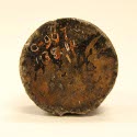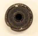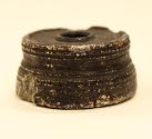 ink well made of soapstone. Origionally part of a set. Round, black, carved with horizontal ledges.