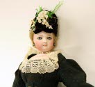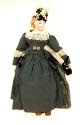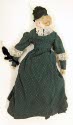 DescriptionParian head, kid body, jointed, blond hair wig, blue eyes. Dark green crepe dress, white pantelettes, and petticoat with eyelet and tucks. Should have two more petticoats, white stockings. Black cloak fringed with fur is 1938.40.18, C-993.On View