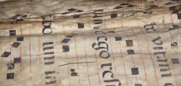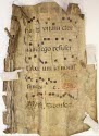 DescriptionSingle page, possibly removed from a hymnarium, with hand-printed Latin text and square musical notes on both sides. Part of the binding on one side with several cut leaves, indicating that the pages had been cut, and torn from a book. Red and black ink.On View