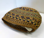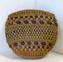 DescriptionPlaited and twined flexible envelope or bag. Plaited dyed strips of green, purple and red inserted through openwork warps. Top rim or edge is plaited and curved.On View