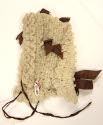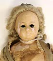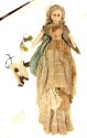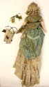 DescriptionBlonde real hair done in a bun on top with two braids down the back tied with pink bows. Body is cloth, the porcelain legs jointed at the knee. Blue and white striped stockings and bright blue china high-button shoes, topped with a tiny blue silk tassel. Two piece sea-green taffeta dress, trimmed pink taffeta, and ribbon neck-tie. White chemise and two white, lace-trimmed petticoats. Crocheted bonnet is missing.On View