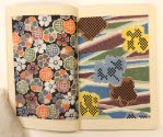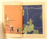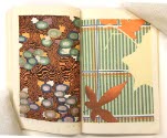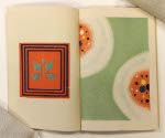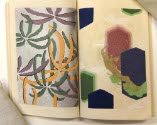 DescriptionBook of colored designs, varied, some look 1930's. Cover of heavier paper, vertual one half green with floral motif-script other side. Pages tied with purple silk.On View