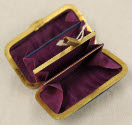 DescriptionFlat blue grosgrain purse. Flower design hand painted on front. Lined with fuchsia taffeta. Has five inner pockets. Gold plated frame. One inner pocket has metal fasteners.On View