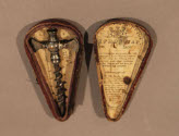 DescriptionMetal patented siphon tap, in leather case. This screw type object is for siphoning off of effervescent drinks. Printed directions for use are pasted on the inside of the case; on the other side is a drawing of the tool.On View