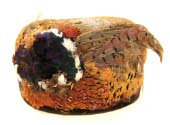 DescriptionLady's hat, entirely covered with multi-colored pheasant's feathers, feathered rosette and tail feathers on one side. Has a very narrow brown velvet brim, and the crown is covered with a fine brown meline, to protect the feathers.On View