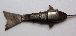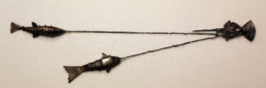 DescriptionSilver shawl pin. The pin part consists of a fan-tailed bird, with long, sharp hand-made skipe at the back. To this is attached, on two fine chains, a cuttle-fish which is made in sections and bends on tiny metal wires. One has blue bead eyes. Origin unknown. Two cuttle-fish, one is round, one a bit flattened.