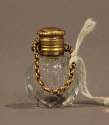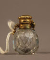 DescriptionCut glass in round shape with top of gold metal. Top lifts up to expose glass stopper. Gold metal chain loop.On View