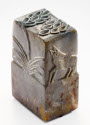 DescriptionRectangular grey soapstone, upper half carved in relief with trees and deer. Leaves on trees on the top are green stone.On View