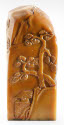 DescriptionTall square shape in light brown soapstone. Building and trees carved in relief on all sides.On View