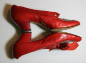 DescriptionA pair of red leather shoes, each with silver beadwork on the toe of the shoe. The beadwork looks like a vine or twig and leaf motif. There are two loop holes, one on either side of the top front of each shoe. The right shoe has a red ribbon threaded through the lace holes. The left shoe is missing the ribbon.On View