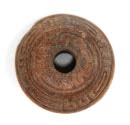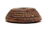 DescriptionSpindle whorl with design in low relief. The motif on the side is repeated four times. Red slipped greyware, highly burnished. Slip survives better on bottom where not badly eroded.On View