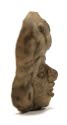 DescriptionThe grey clay mask depicts a woman's face. The headdress is a braided knot, directly below which is a thin band of incised vertical lines which rather resemble bangs. On either side of the band lies two horizontal bands. The face has elongated eyes, a large nose, and an open mouth, within which are teeth. There are two earplugs on the figure. Probably an adorno off an urn; mold made; stylistically typical.On View