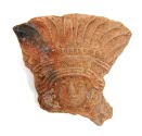 DescriptionHead of flat mold-made clay figurine with elaborate, feathered headdress and ear plugs. The black is unmodelled, so perhaps the piece was an "adorno" attached to a vessel such as an incensario. Buff clay with faint traces of red paint.On View