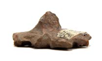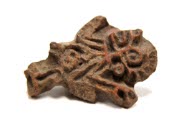 DescriptionA gray flat stamp with incised design on front and back pinched out to form a handle. There are traces of red pigment on incised design; the design is the dancing monkey motif; stamp seal with handle on back.On View