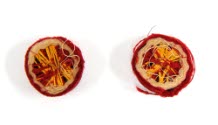 DescriptionPair of earrings, red fabric wrapped around a circle, end woven in red and yellow.On View