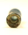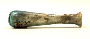 DescriptionPale green glass with blue and mother of pearl iridescence. Flaring lip; round flat in center. The neck narrow part way down before swelling into a bulbous tip. For perfume.On View