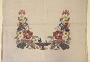 Description"Between Meals" cloth woven in a tapestry design of hollyhocks and birds. The name "Elizabeth Fiske" is woven into the hem. An article from the "Ladies Home Journal" describing this cloth is rolled with it.On View