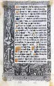 DescriptionPage from "Book of Hours" hand illuminated in blue and brown ink and gold; wood engravings surround Latin script on all four sides; blocks are wider at the bottom and outside away fro,m book centr of page; both sides printed; one side mostly decorative; people holding stalks of wheat and grain; peasant burdened with pedestal on his head upon which a soldier stands; in ower portion, a landscape with a castle, lake, villege, treesOn View