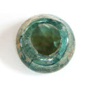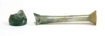 DescriptionTall cylindrical neck with flared lip and conical shaped body widening to flat base. Patches of mother of pearl and blue iridescence. Paint vertical lines on upper portion of one side of neck. Broken in half just above base.