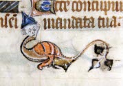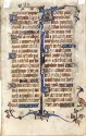 DescriptionLatin text in two columns; brown ink for lettering; initials decorated with blue, gold, black, white, and brown; left margin decorated with blue and brown motif, top to bottom ending in leaf motifs; grotesque with human face wearing peaked hat at bottom margin, other square and rectangular motifs within text; verso: blue decoration runs top to bottom between columns of text, bird in marginOn View