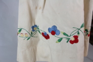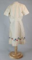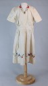 DescriptionYoung girls' dress of white twill with set in belt. Machine made. Reverse and bottom of dress are embroidered in a flower design in red, yellow, green and blue. Rest of dress is plain.On View
