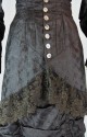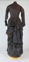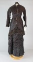 DescriptionTwo-piece brown silk dress, with black faille trimming, moire bow on the jacket bodice, dark mother-of-pearl buttons, trimmed with brown roe-point lace.On View