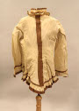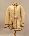 DescriptionTwo-piece, off-white linen suit, trimmed with brown cotton bias stripe. Skirt has deep cased flounce at hemline with brown cotton strip above it and finishing its hem. Hem of skirt stiffened and bound with brown wool twill tape. Skirt fastens with a button at center back of waistband. Back section of skirt on a drawstring to be drawn in and tied around waist. Jacket falls free in front, fitted in back. Bottom edge of jacket and sleeves have edged ruffles. edged in brown cotton. High neck has double ruffle edged in brown cotton. Patch pockets on front. More cotton strips for trim on front and back. Jacket is unlined, as is skirt, and closes with Mother of Pearl buttons down the center front.On View