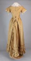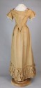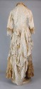DescriptionSkirt of heavy gold silk faille with short sleeved boned bodice in same fabric. Three rows of pleating above hemline. Back of skirt pleated onto waistband with center back button closure. Skirt fully lined with a light weight stiffening, hemline has a second layer of heavier stiffening. Lighter ivory colored overgown trimmed with lace and ruffles made of the silk faille.On View