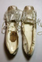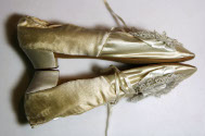 DescriptionCream satin slippers, lace and satin bow in front. Heel 1 1/4" square toe, ties.On View
