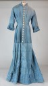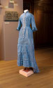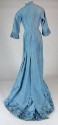 DescriptionBlue silk dress, princess style with train back. Front has wide, horizontal pleats descending from thigh level to just about the three ruffles at the hemline. Dress has a sheath-like fit to the hips. Three-quarter lenght sleeves are edged in three inch pleating. High neck has a small standing collar. The dress closes down the center front (from the neckline to the top of the first pleat) with mother of pearl buttons. Dress is fully lined in tan cotton, with stiffening inside hem and lower portion of train.On View