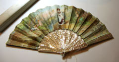 DescriptionPaper fan with plain mother-of-pearl sticks. There is a scene painted on the fan leaf of a young woman standing in a landscape with cupids. There is a flower border which, on each side of the front, starts 1/3 up the outside edge, goes down across the side edge, and the 1/3 up the inside edge. The back of the fan has no painted scene but the flower border is the same as on the front. The leaf of the fan uses just over 1/2 of the length of the sticks. On the back, bottom inside corner left side, in small blue letters: Tiffany & Co. On the front, right side center, in purple: S. Poussin. The fan is in a white silk box with Tiffany & Co. inside lid.On View