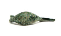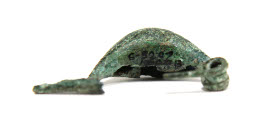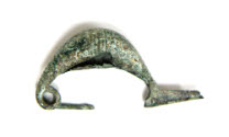 DescriptionSmall fibula with 4 circles and 3 sets of lines across the top and ends.On View