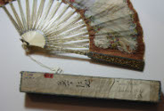 DescriptionIn the center of the leaf are two figures in classical dress. A standing female holding a basket of flowers, a kneeling male holding flowers out to a statue. the statue is to the left of the figures and is a cupid-like figure with a dog. The rest of the scene is sketched in with pastel colors. There is a border around the scene in orange-brown with gold cross hatching. On the inside edge of the border there are flowers. The back of the fan is plain with just a gold line around the edge. The sticks are of ivory pierced with a design of circles. The sticks are gilded and silvered. The stud has two stones, on clear, on a dark yellow or brown. The box is of blue silk with painted flowers. One the bottom there is Asian lettering and a card glued to it which says, "Vernis Martin" London 1871 LS.JOn View