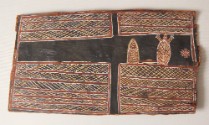 DescriptionBark painting. Against a black background, four rectangular areas filled with rows of cross hatching. On the right a form filled with dashes. An anthropomorphic figure and a round object with multiple projections, filled in with dots are grouped together.On View