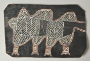 DescriptionBark painting. A single figure, outlined in yellow, red and white filled in with crosshatching and dots. The background is black. Rocky Dreamtime Landscape?On View