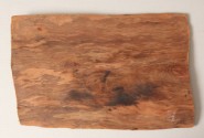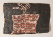 DescriptionBark painting. The background of this bark painting is black. The image is outlined in white and red and filled in with red and white diagonal lines and crosshatching. possibly a tree or plant in Dreamtime landscape.On View