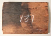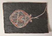 DescriptionBark painting. A single figure of a sting ray outlined in white, filled in with dots and lines against a black background.On View
