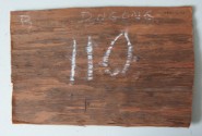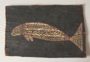 DescriptionBark painting-Dugong. This bark painting is of a single figure against a black background. The figure is a dugong (an aquatic mammal), outlined in brown filled in with yellow and white dashes and crosshatching.On View