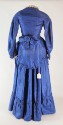 DescriptionOne piece, bright blue dress (.l) with separate overskirt (.2) of corded silk taffeta. Fitted bodice has jewel neckline, long fitted sleeves. Bodice neckline, front edge, and sleeves edges are trimmed with soft pleated lace. Back of skirt is cartridge pleated onto bodice. Skirt has a wide bias ruffle above the hemline. The top of the ruffle, wrists of the sleeves and hemline of the overskirt are trimmed in ruching of the same silk. The dress closes at the waist which has hook and eye closures there and at the left side front. The separate overskirt is apron-like in front and split up the center back. The back portions are cartridge pleated onto the waistband, with a center back hook and eye closure. The bow on the center front belongs at the center back waist. The waistband has stiffening, the overskirt is unlined. The skirt is lined in tan glazed cotton, the hem bound in blue wool twill tape, and hidden pocket in the right side front seam. The bodice is not boned, but is lined in tan cotton twill.