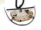 DescriptionThin slice of an almost cleat - colored agate with brown and black spots 4 cm x 2.6 cm set with a silver bar across the top and a curved bar under hanging on a black cotton cord.On View