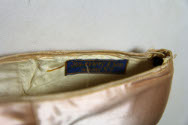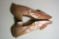 DescriptionPink satin slippers with low heels and satin rosettes, pearls, 1 1/2" satin heel.On View