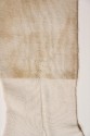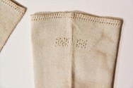 DescriptionStockings, white cotton, hand knit, calf section considerably darker than ankle and foot section. Very small simple lace detail at cuff edge, and simple purl stitch clocks at ankles.On View