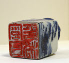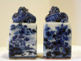 DescriptionOne of two blue on white china seals with a dragon on top. 1962.6.5 has a scene of village below a mountain, four characters on the bottom; 1962.6.6 has a scene of a house, rocks, fence, trees, six characters of the bottom.On View